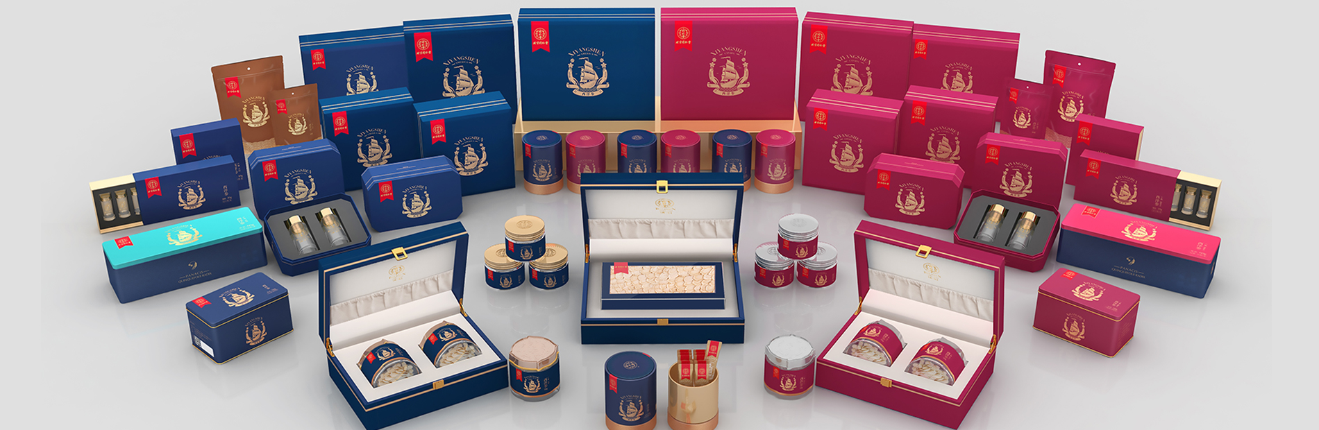 以皇后號(hào)帆船作為西洋參的文化象征符號(hào)和設(shè)計(jì)源點(diǎn),以西洋參的外形形象凸顯產(chǎn)品道地的黃金品質(zhì)。同時(shí)繼承同仁堂的文化精神,以古代只有皇家貴族才使用的傳統(tǒng)紋樣“江岸海水”來(lái)傳承延續(xù)同仁堂連續(xù)188年供御藥殊榮,同時(shí)也證明同仁堂成藥的品質(zhì)優(yōu)良,可以和御藥房所制成藥互為“替代”。