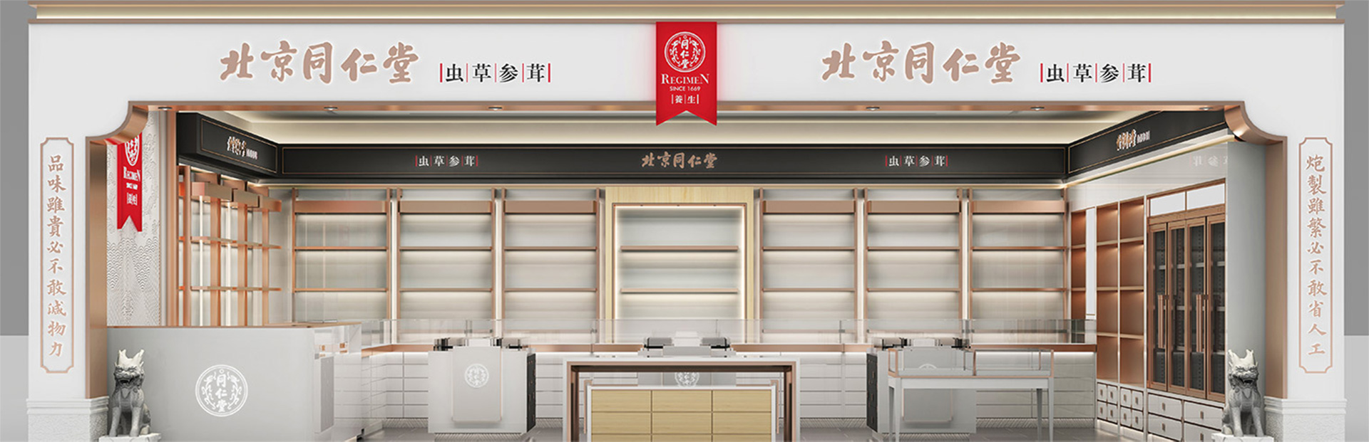 采用深灰、白和玫瑰金色搭配,使整體店面既有富麗堂皇之氣場(chǎng),也有清新脫俗之雅韻。一方面與同仁堂傳統(tǒng)店面形象區(qū)分開來(lái),另一方面在傳承同仁堂文化的同時(shí)也對(duì)同仁堂形象進(jìn)行了升華,使其店面更具視覺特點(diǎn)和識(shí)別性;更加現(xiàn)代時(shí)尚,符合未來(lái)人群的審美情趣。